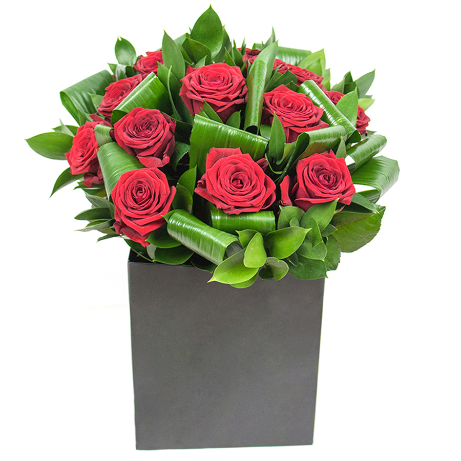 Celebrate special moments with our exquisite bouquet featuring vibrant red roses, elegant aspidistra leaves, and charming ruscus. This unique arrangement radiates beauty and elegance, making it a perfect gift for any occasion.