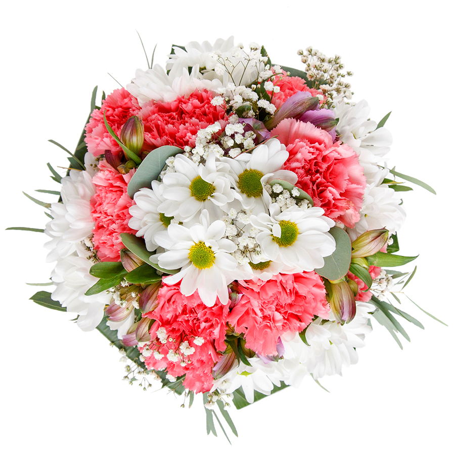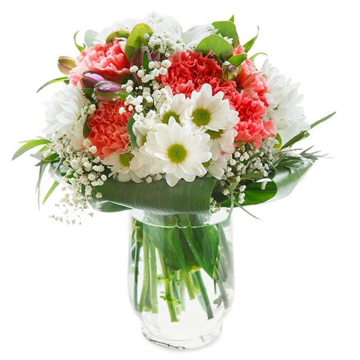 Brighten any space with our radiant seasonal floral display, expertly assembled to create a captivating centerpiece. Featuring immaculate white chrysanthemums, delicate gypsophila, and subtle light pink carnations, all harmoniously accented by aspidistra leaves, this arrangement embodies both sophistication and natural beauty. Every bloom is hand-selected for its excellence, ensuring a fresh and lasting impression.